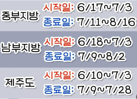 중부지방은 6월 26일부터 7월 26일, 남부지방은 6월 25일부터 7월 26일, 제주도는 6월 25일부터 7월 25일까지였습니다. 작년 장마 강수량은 660mm로 3번째 많은 강수량을 기록했습니다.