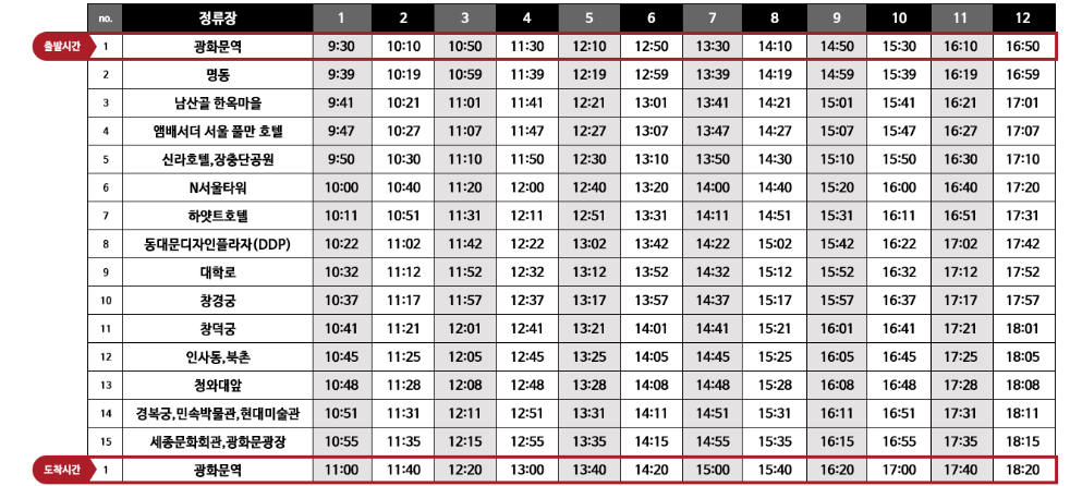 서울의 주요한 관광지를 순환하면서 시끌벅적한 도심과 고즈넉한고궁, 남산이 어우러진 서울의 아름다운모습을 볼 수 있는 코스입니다. 원하는 정류장에서 하차하여 자유롭게 관람 후 다음 버스를 이용할 수 있습니다.
